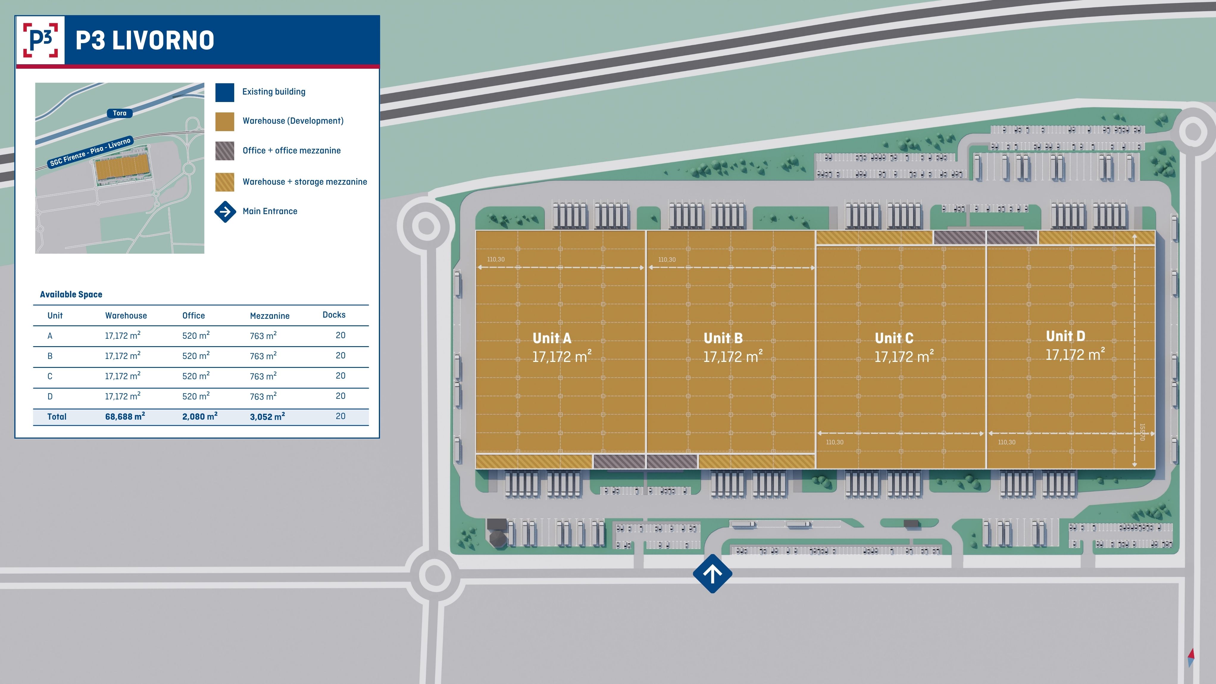 P3 is developing a new logistics warehouse with a total of approximately 70,000 m² of logistics space, plus around 2,000 m² of office space and approximately 3,000 m² of mezzanine. Ample parking spaces for cars and trucks are available. Some parking spaces will be equipped with electric charging stations.