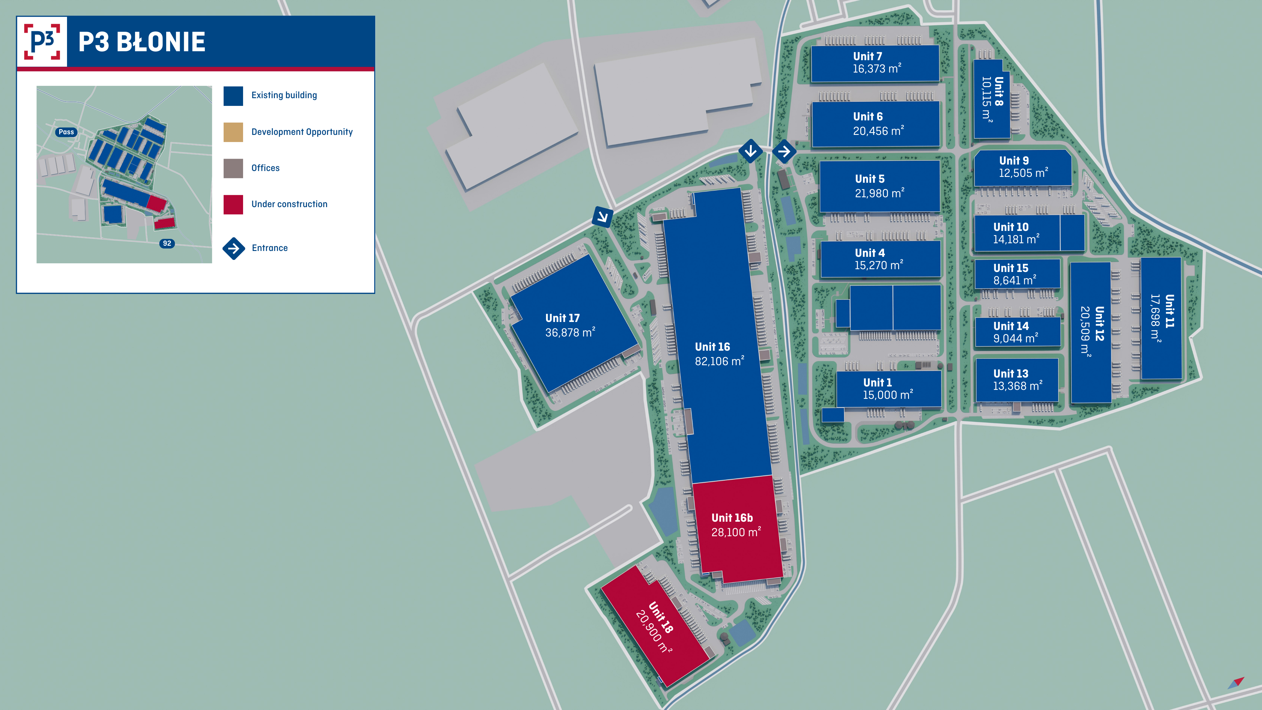P3 Blonie se encuentra en Blonie, a 27 km al oeste de Varsovia, en el cruce de la carretera nacional 92 con la autopista A2 (E30 European transit route). Hay 15 naves en total que fueron construidos entre 1999 - 2022. Los clientes más grandes del parque son Antalis, DSV Solutions, Wilshire Holding, IBM, Europapier y Triumph.