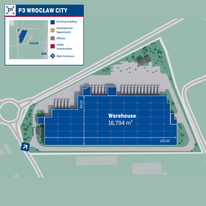 P3 Wrocław City is an urban warehouse with a total area of 18,500 m², including 16,700 m² of warehouse space and 1,800 m² of office space.