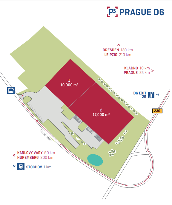 P3 Prague D6 is located approximately 20 minutes from Prague at exit 25 on the D6 (Prague – Karlovy Vary – Germany), with excellent visibility from the motorway. The park is reachable by public transport (the bus stop is directly in front of the park), and the railway station is 1 km from the site.