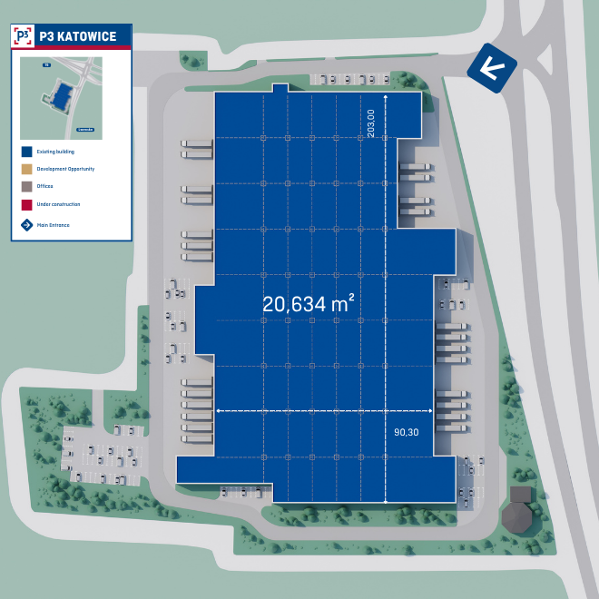 P3 Katowice City is a modern warehouse park located on Lwowska Street, in the eastern part of Katowice, right next to the exit from National Road No. 79. The 4.7-hectare site features a state-of-the-art warehouse facility with a total area of 25,000 m², designed for tenants for whom proximity to the city center is a key factor.