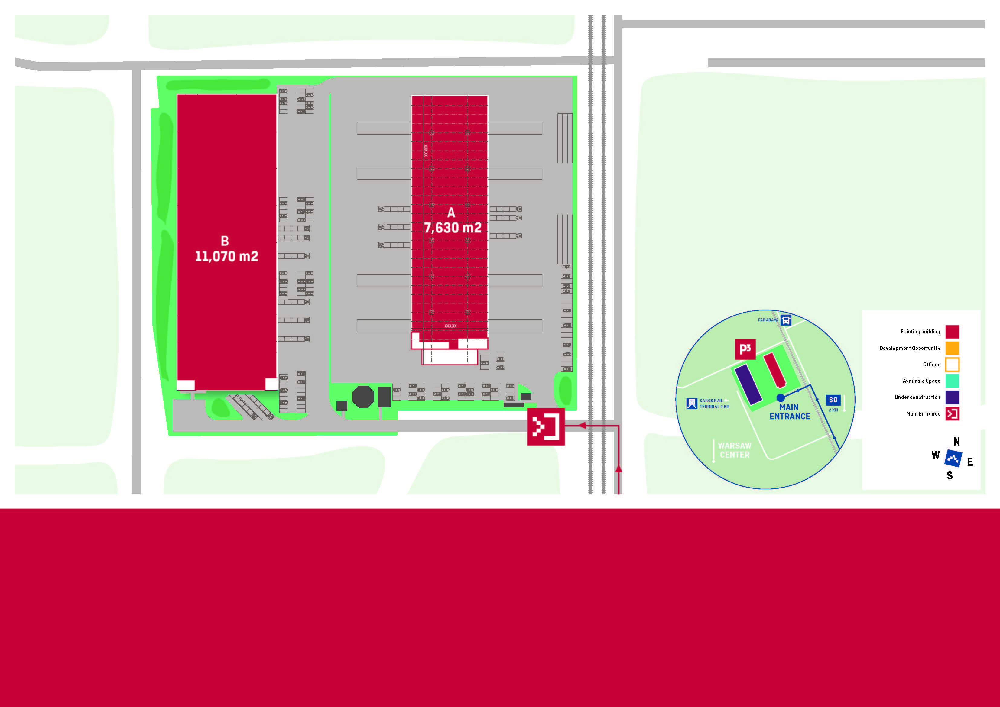 P3 Warsaw II is located in the northern part of Warsaw, at Faradaya street, near the S8 expressway and 12 km from the city centre of Warsaw and 22 km from Warsaw Chopin Airport. The park is easily accessible by public transport - there are bus (lines 234 and 314) and tram (lines 4 and 41) stops right next to it. Thanks to its excellent location, it is a perfect place for city logistics. The investment includes 2 BTS buildings. The warehouses will be equipped with pro-ecological solutions, such as Energy-saving LED lighting with an automatic control system and electric car charging stations.