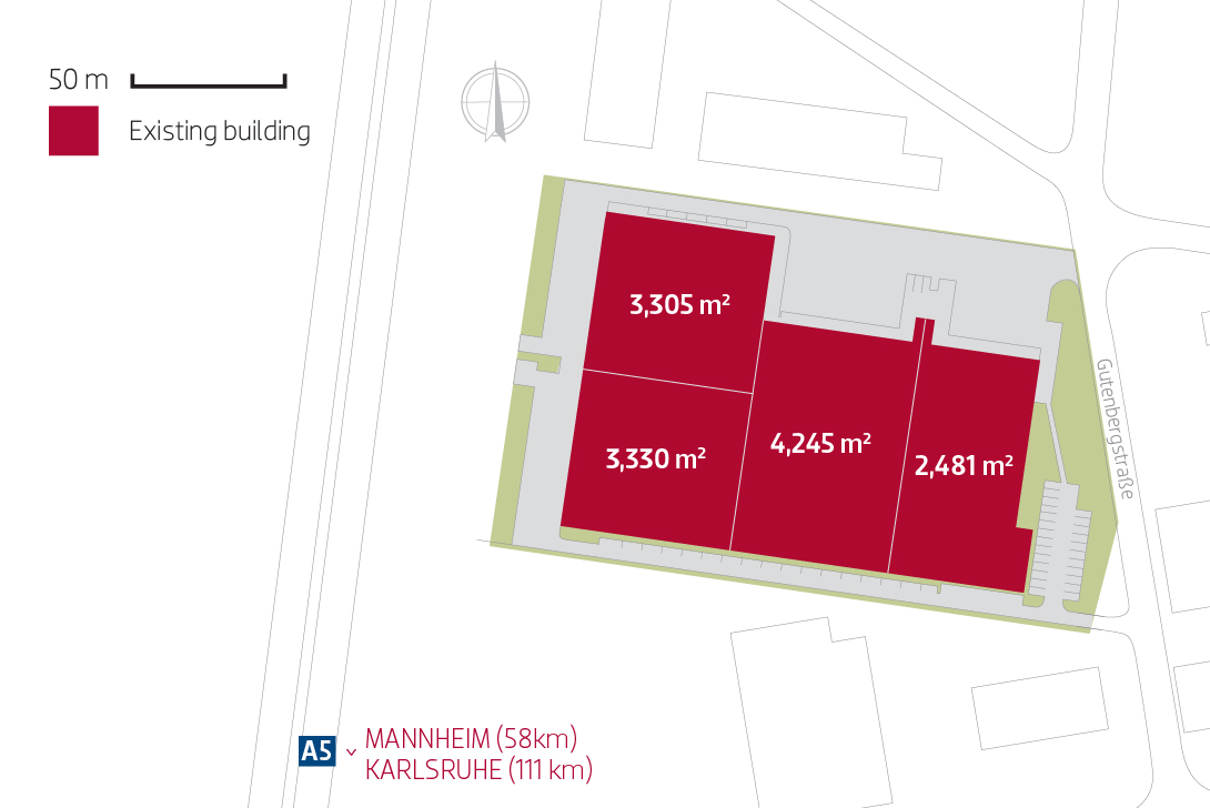 Ten obiekt logistyczny jest położony w przemysłowej części Weiterstadt, w odległości około 6 km na północny zachód od Darmstadt i około 24 km na południe od lotniska we Frankfurcie. Charakteryzuje się dobrymi połączeniami transportu drogowego ze względu na bliskie sąsiedztwo autostrady A5 i drogi krajowej B42. B42 stanowi również idealne połączenie między obszarem przemysłowym Weiterstadt a autostradą A67. W ostatnich latach Weiterstadt stało się popularną lokalizacją dla supermarketów i magazynów. Obiekt składa się z dwóch hal o zasadniczo identycznej konstrukcji, z bezpośrednio przyległymi strefami biurowymi. Hale składają się z jednej kondygnacji i są ustawione pod kątem prostym. Obiekt został wybudowany w 2007 roku.