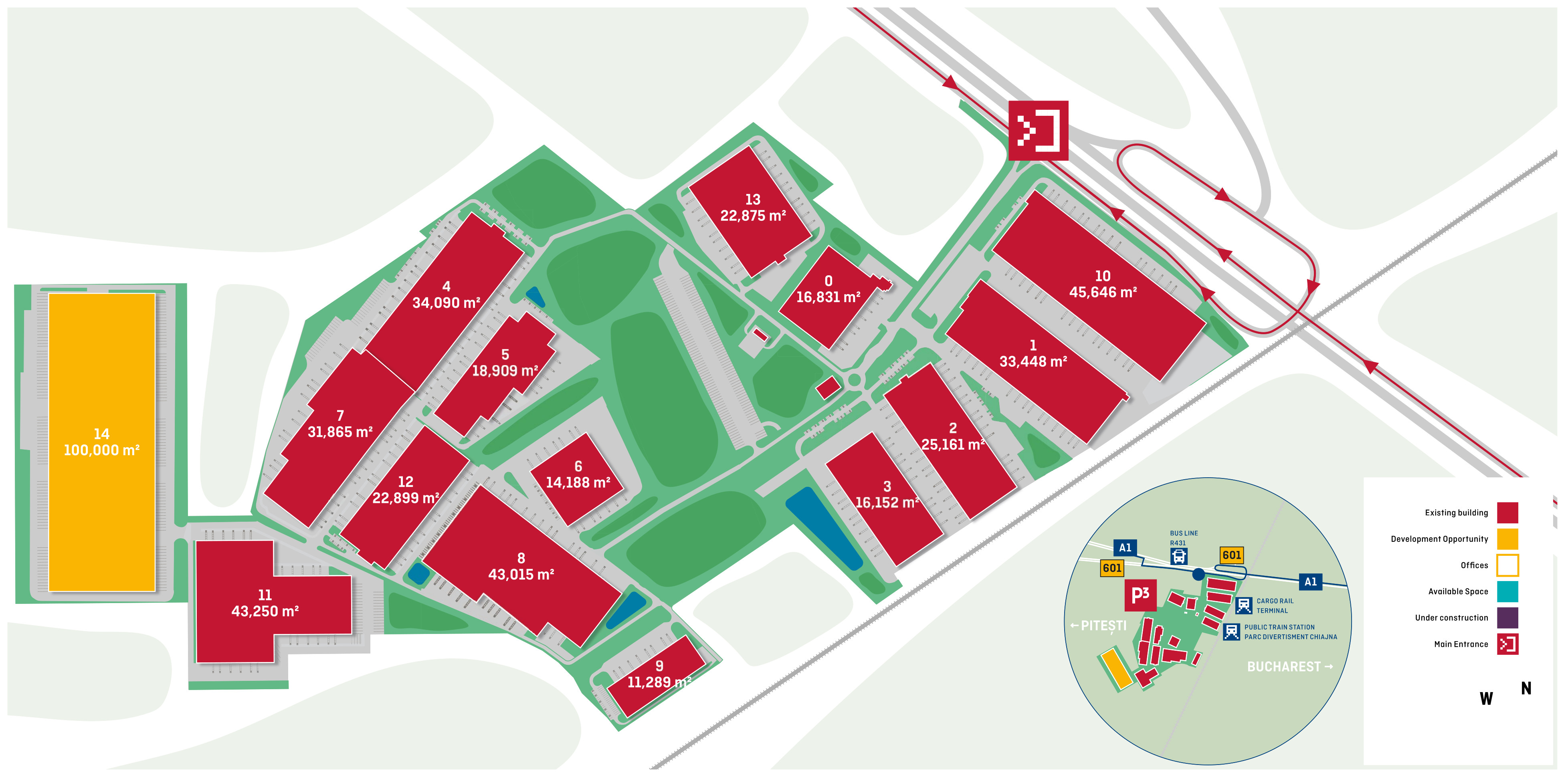 Suprafața totală a parcului este de aproximativ 380,000 mp și cuprinde în prezent 14 clădiri, o stație electrică și un terminal feroviar.