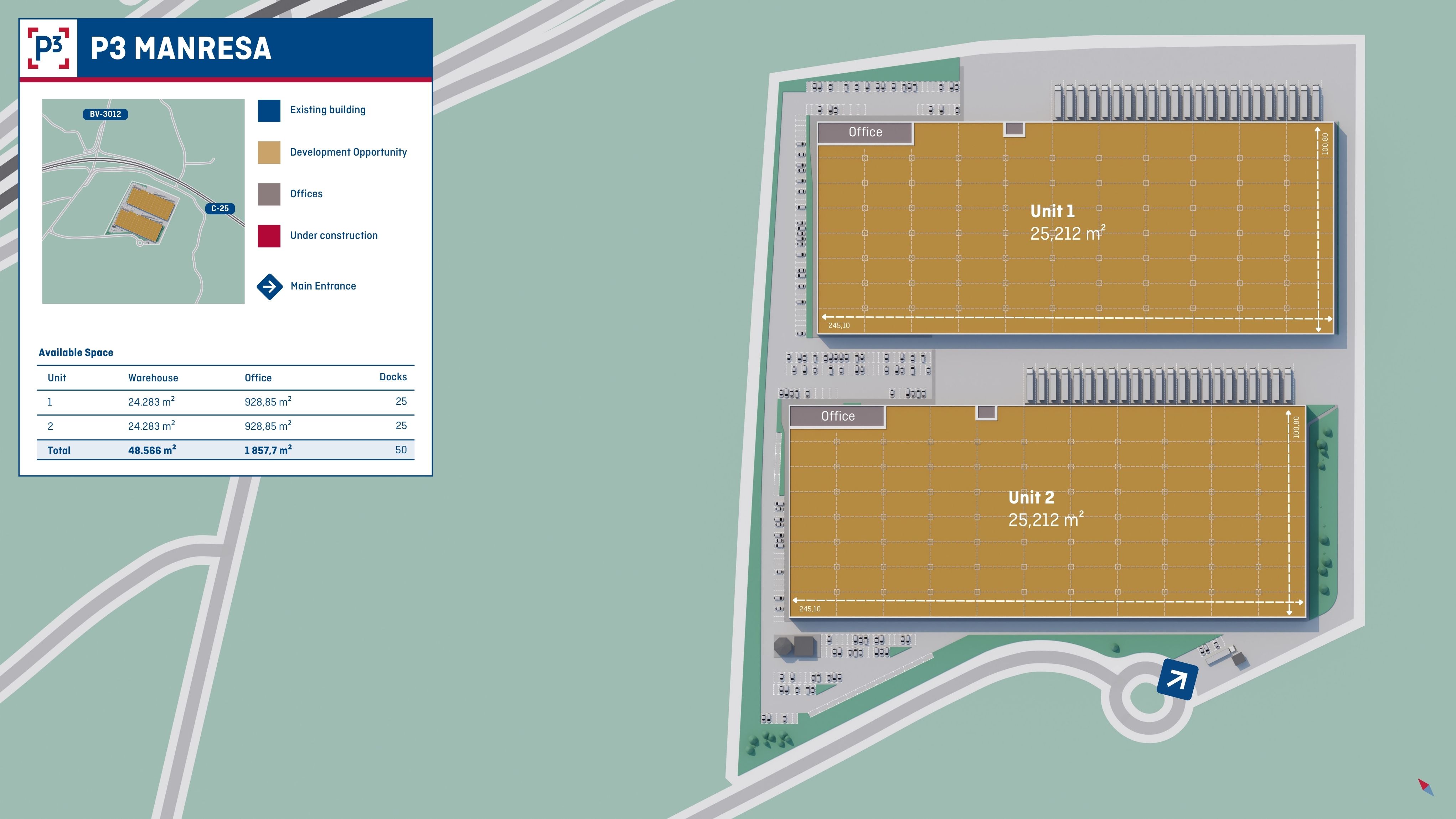 Manresa is a historical industrial cluster located in the province of Barcelona, in the center of Catalonia - one of the most economically dynamic and prosperous regions in Spain. P3 Manresa is located in Barcelona’s third logistics ring, approximately one hour from the city center as well as from the main infrastructures: Barcelona Airport and the Port of Barcelona (ZAL). The area is part of a consolidated logistics environment between Sallent, Santpedor, and Sant Fruitós de Bages, with excellent connections to major transport routes such as the Catalan Transversal Axis (C-25), as well as the C-26, C-55, and C-37 highways.