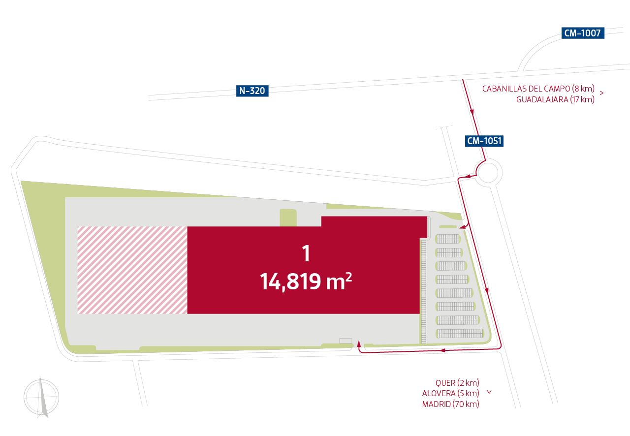 Acest depozit logistic este situat în orașul Quer, în provincia Guadalajara. Proprietatea este situată pe coridorul A2, principalul centru industrial al țării care leagă Madridul de Barcelona. Este situat la aproximativ 50 km de centrul orașului Madrid, aproape de autostrada R2. Companiile mari din zonă includ Factor 5 (3PL), Quilosa, Makro și DHL.