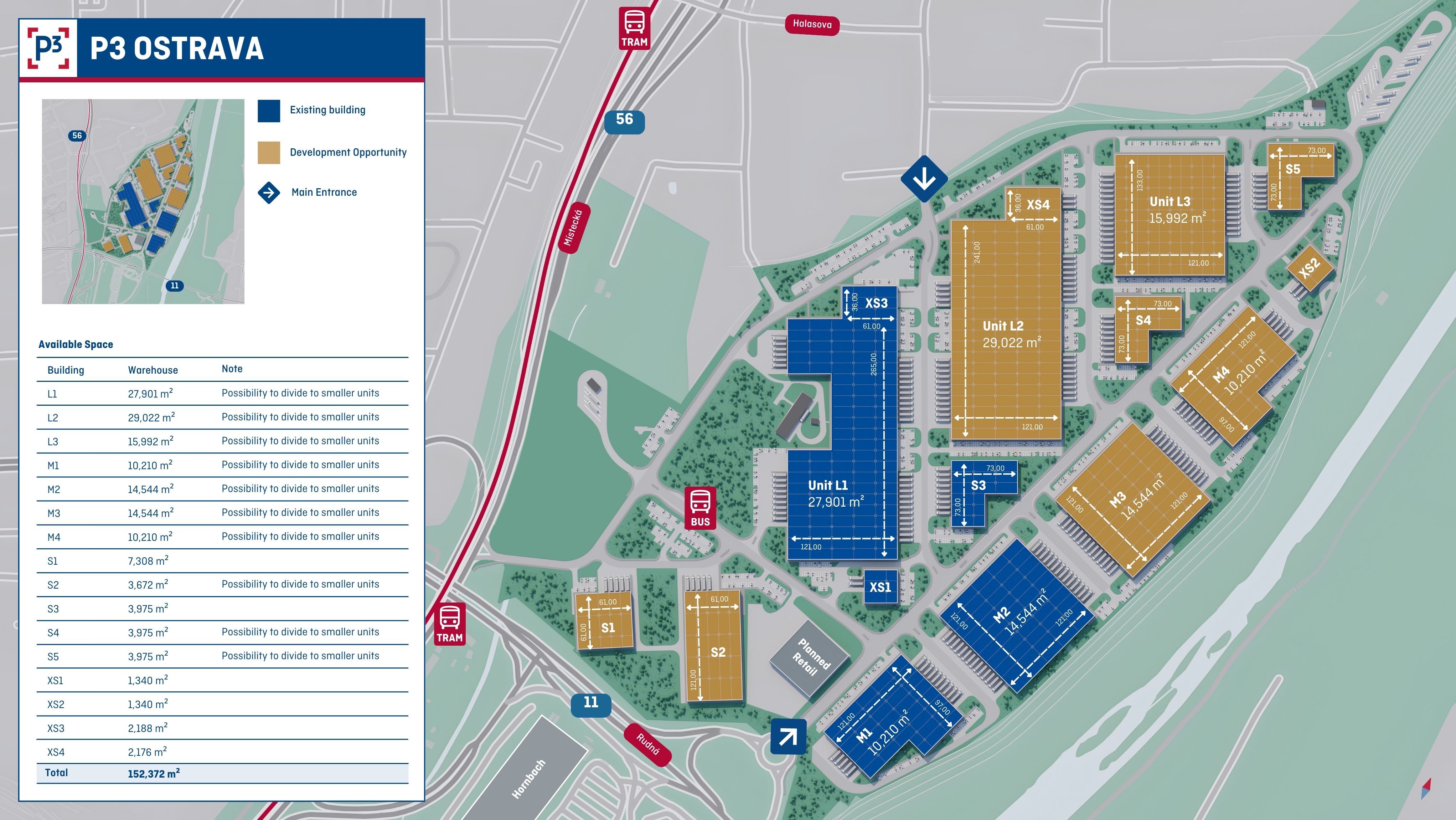 | Budova | Voľný priestor pre development | Skladové priestory k dispozícii | Kancelárske priestory k dispozícii | Celková plocha | BREEAM | EPC | LED osvetlenie | Parkovacie miesta |