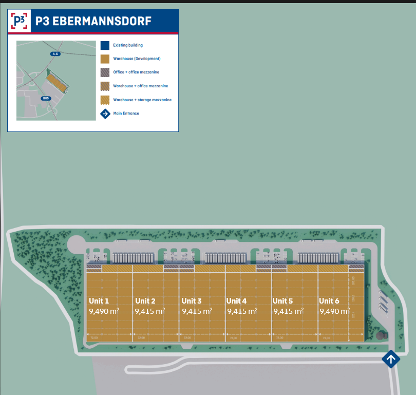P3 Ebermannsdorf comprises one state-of-the-art logistics hall with approximately 56,640 sqm of logistics space, complemented by around 1,060 sqm of office space and 3,630 sqm of mezzanine space. The flexible layout allows the space to be subdivided into up to six units, making it suitable for both logistics and light production operations.