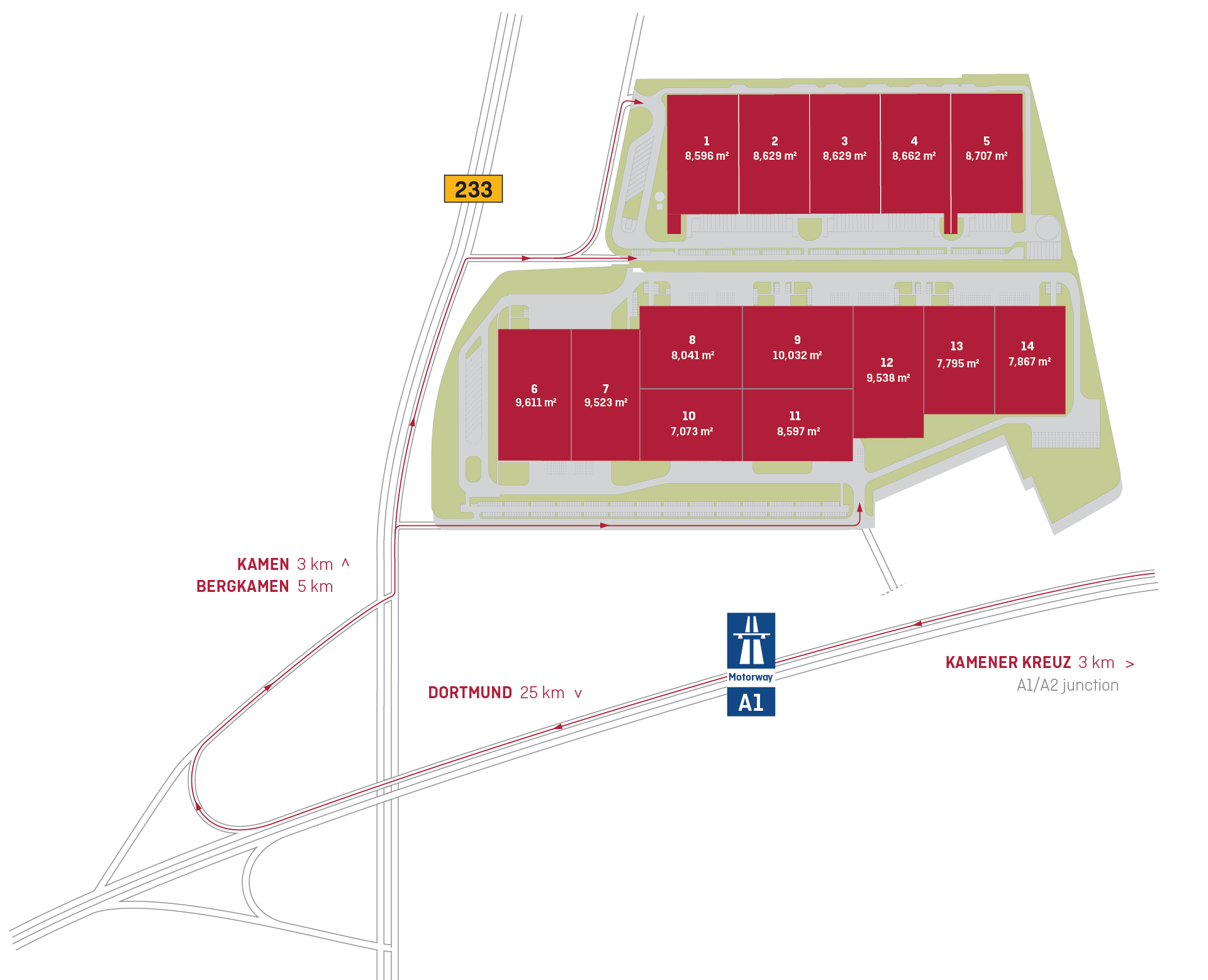 P3 Kamen park leží v oblasti východného Porúria v okrese Unna s vynikajúcimi diaľničnými prípojmi. Nachádza sa v blízkosti frekventovanej križovatky pri meste Kamen, kde sa pretínajú dva rušné diaľničné spoje: diaľnica A1 pre trasu zo severu na juh (Hamburg - Kolín nad Rýnom – Saarbrücken) a diaľnica A2 pre trasu z východu na západ (Oberhausen – Hannover – Berlín). Letiská v Dortmunde a Düsseldorfe sú vzdialené len 13 km a 40 km od parku.