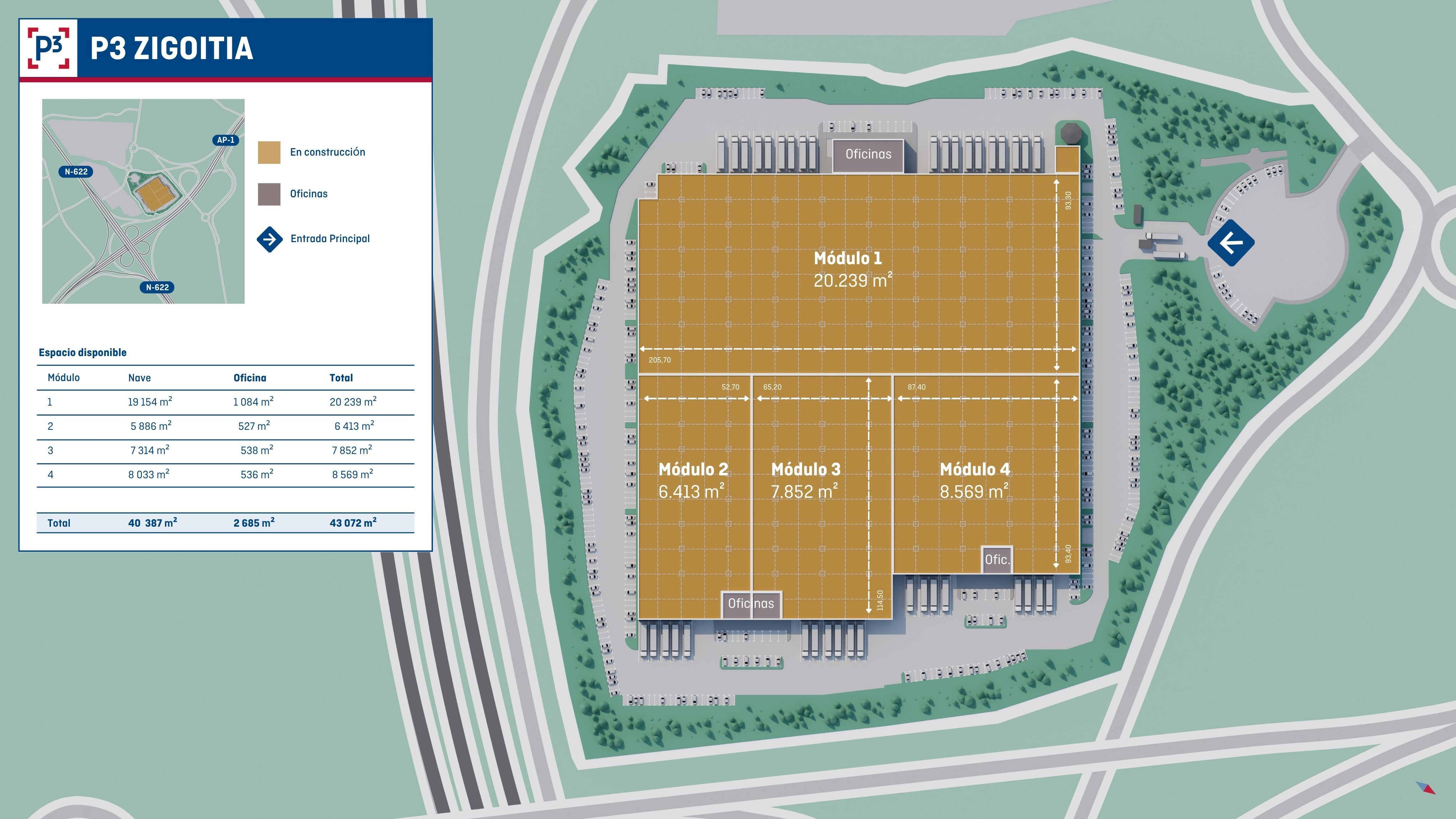 P3 Zigoitia is a new development located 7 minutes from the capital of the Basque Country, Vitoria-Gasteiz, placing it in a strategic enclave for both national and European logistics. It benefits from excellent connectivity and strong infrastructure, with direct access to the AP-1, A-1, and N-622 highways.